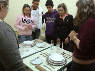 Nos dias 15 e 19 de maio os alunos do Curso de Eventos tiveram aulas práticas sobre a mise en place de mesa para eventos. Após a parte teórica, tiveram a oportunidade de montar diversas formas de mesa para diferentes eventos, percebendo todas a necessidades e dificuldades dessa montagem.